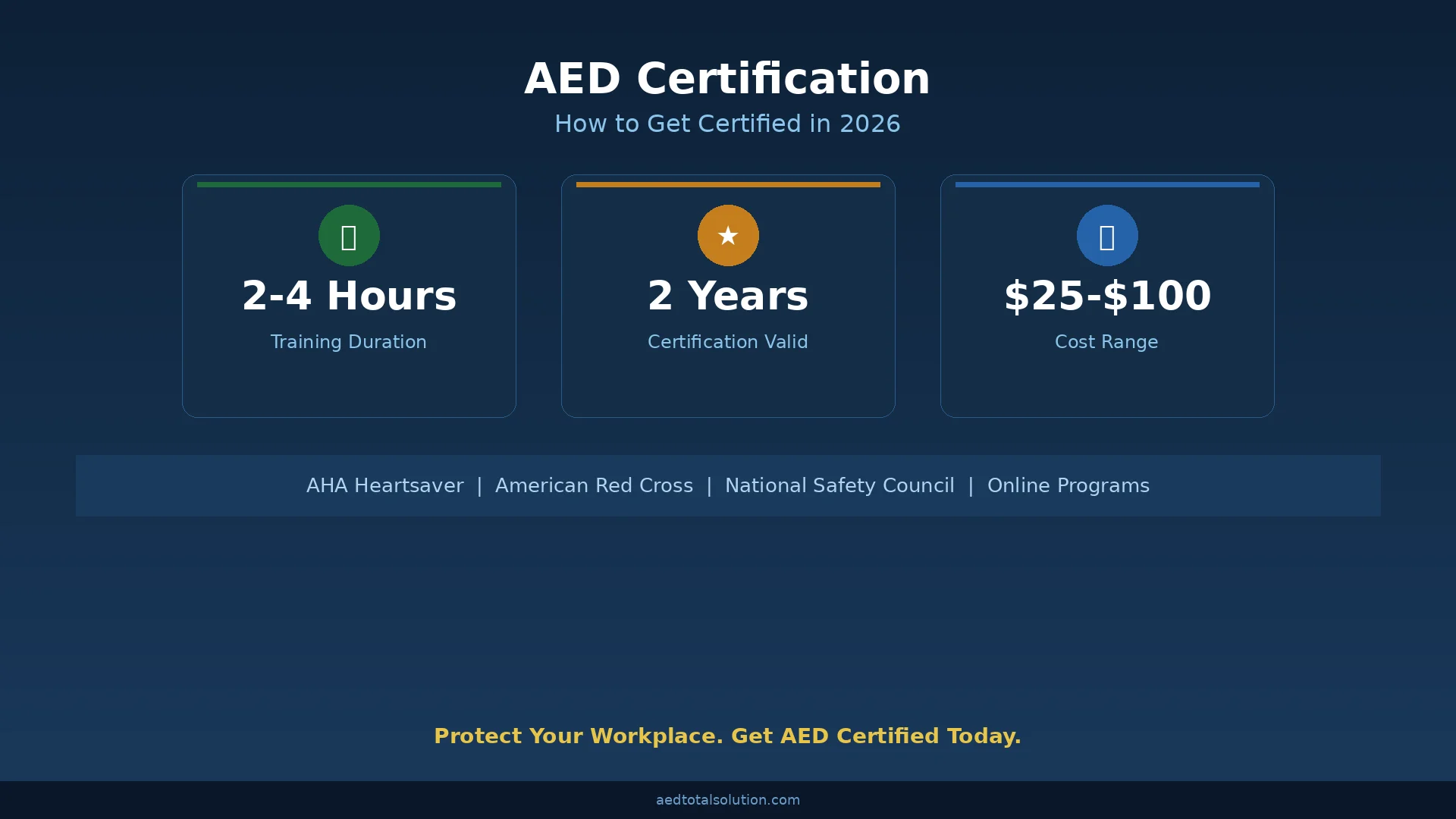 The AHA Heartsaver CPR AED course is the most widely recognized AED certification for non-healthcare professionals. It is designed for anyone with little or no medical training who needs an OSHA-compliant course completion card.
