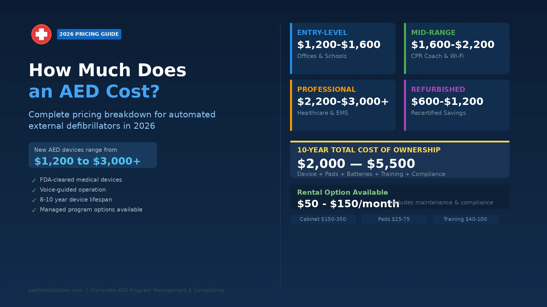 An AED typically costs between $1,200 and $3,000 for a new device, but the real investment goes beyond the sticker price. When you factor in replacement pads, batteries, cabinets, training, and ongoing compliance management, the total cost of ownership over a 10-year lifespan ranges from $2,000 to $5,500 per device. This guide breaks down every cost you need to plan for, from initial purchase to long-term program management, so you can budget accurately and protect your organization.