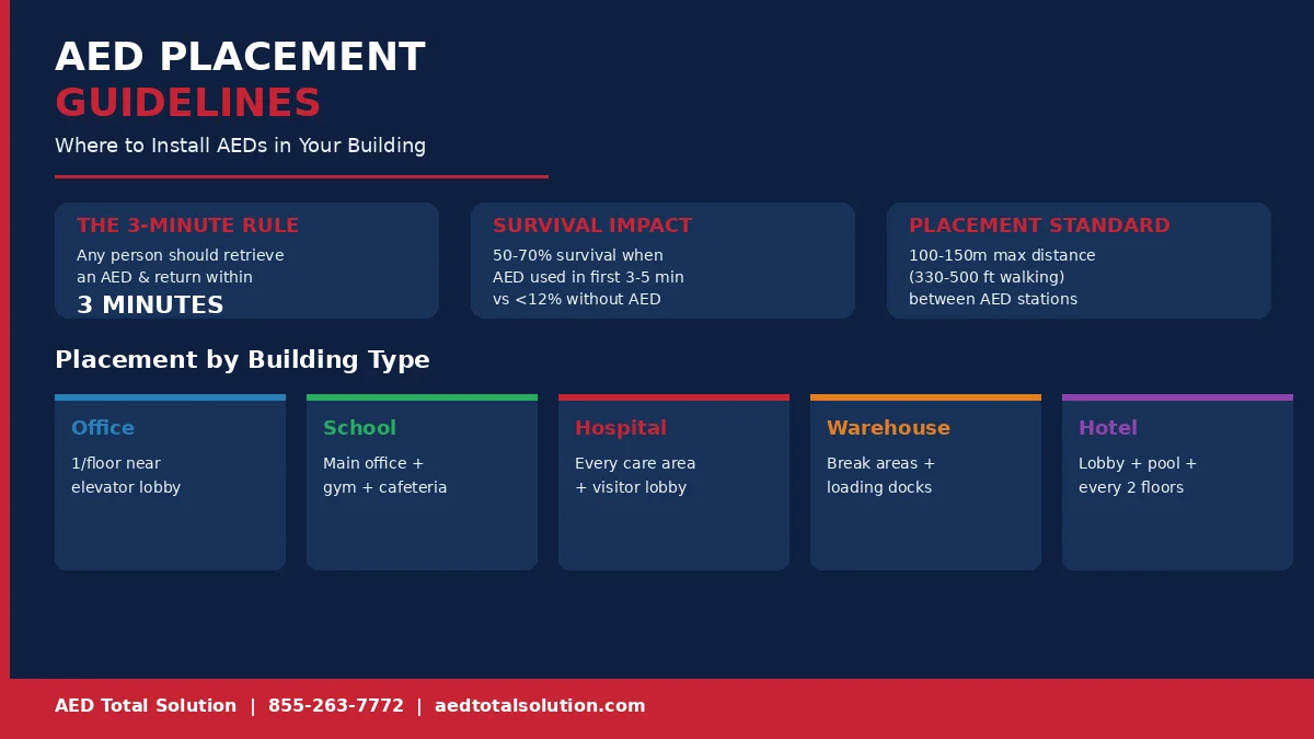The 3-minute rule translates to practical placement decisions: an AED should be no more than a 1.5-minute walk from any point in the building. For a typical office building, this means placing devices approximately every 100 to 150 meters (330 to 500 feet) of walking distance.