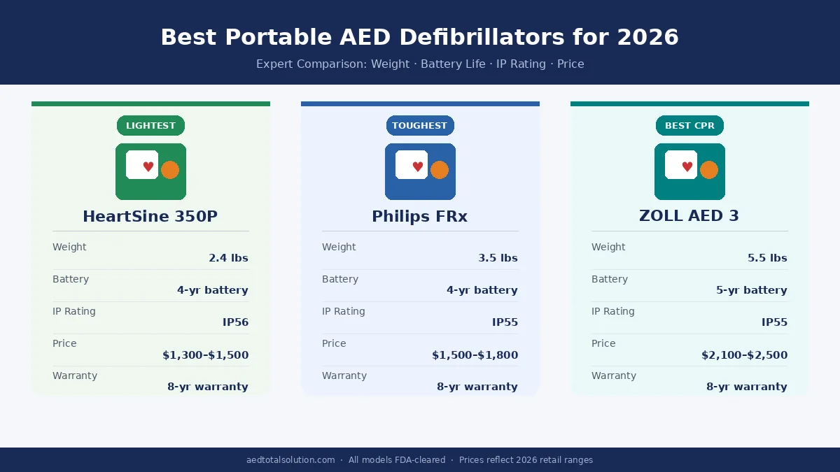 Best portable AED defibrillators for 2026 comparison showing HeartSine 350P, Philips FRx, and ZOLL AED 3 with specs