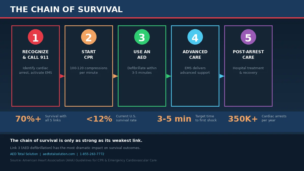 More than 350,000 people in the United States experience out-of-hospital cardiac arrest each year. The survival rate is under 12%. Yet when every link in the chain of survival is executed quickly, survival rates can exceed 70%. The chain of survival is the American Heart Association’s framework for the sequence of actions that gives a cardiac arrest victim the best chance of surviving. Understanding each link, and being prepared to act on it, is what separates survival from tragedy.