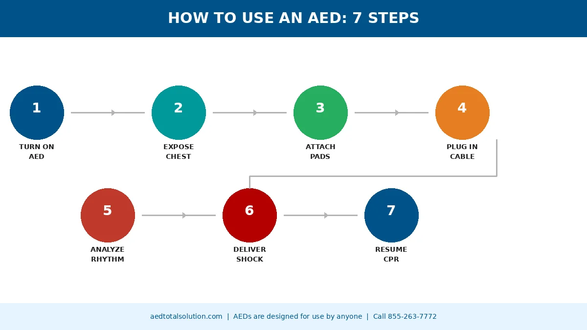 Make sure your team knows how to use an AED before an emergency happens. Contact AED Total Solution for comprehensive AED program management, staff training coordination, and compliance support. Call 855-263-7772 for a free consultation.