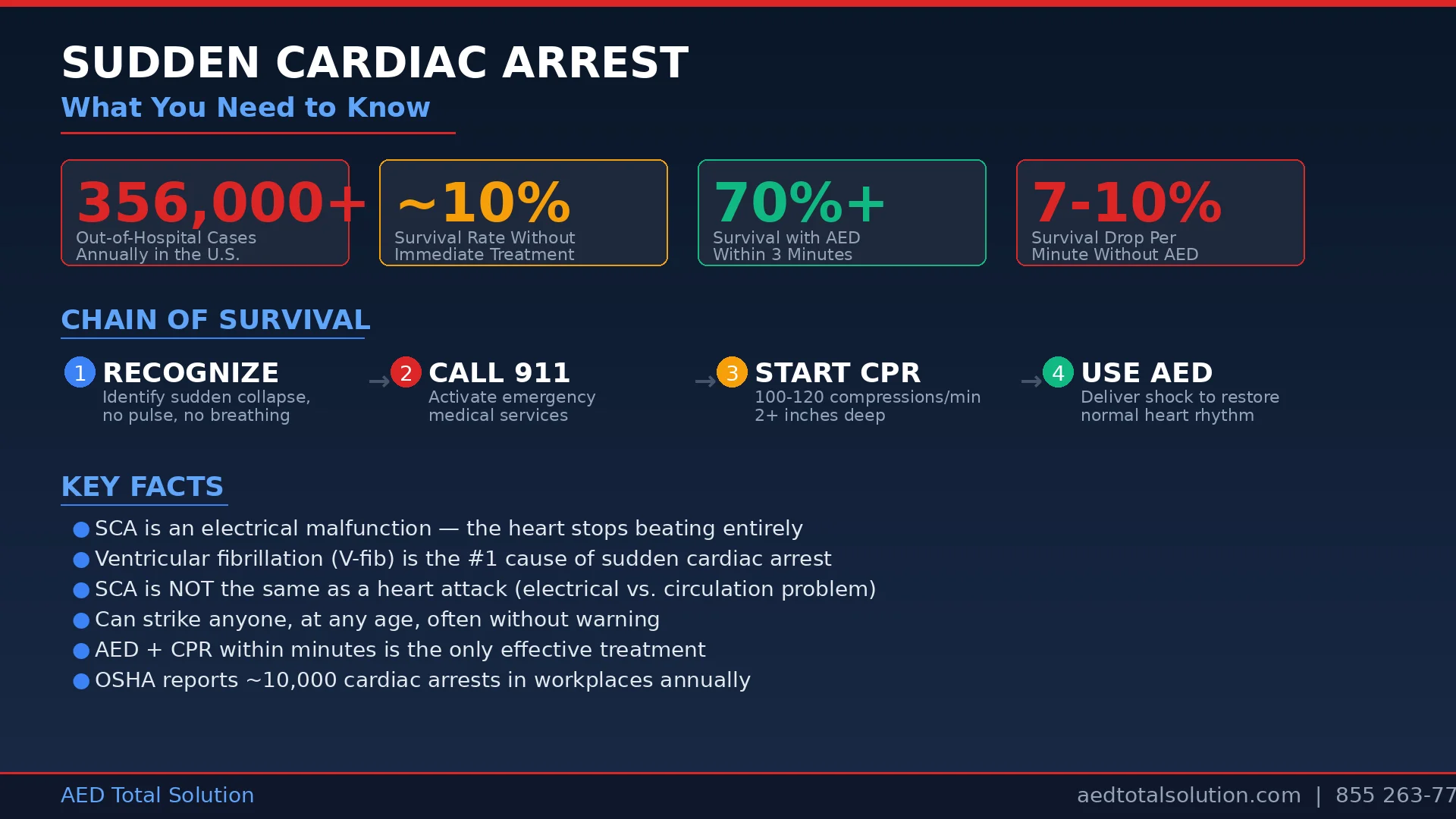 Key Takeaway: Sudden cardiac arrest is a life-threatening electrical malfunction that stops the heart without warning. Survival depends on immediate CPR and AED defibrillation within the first few minutes.